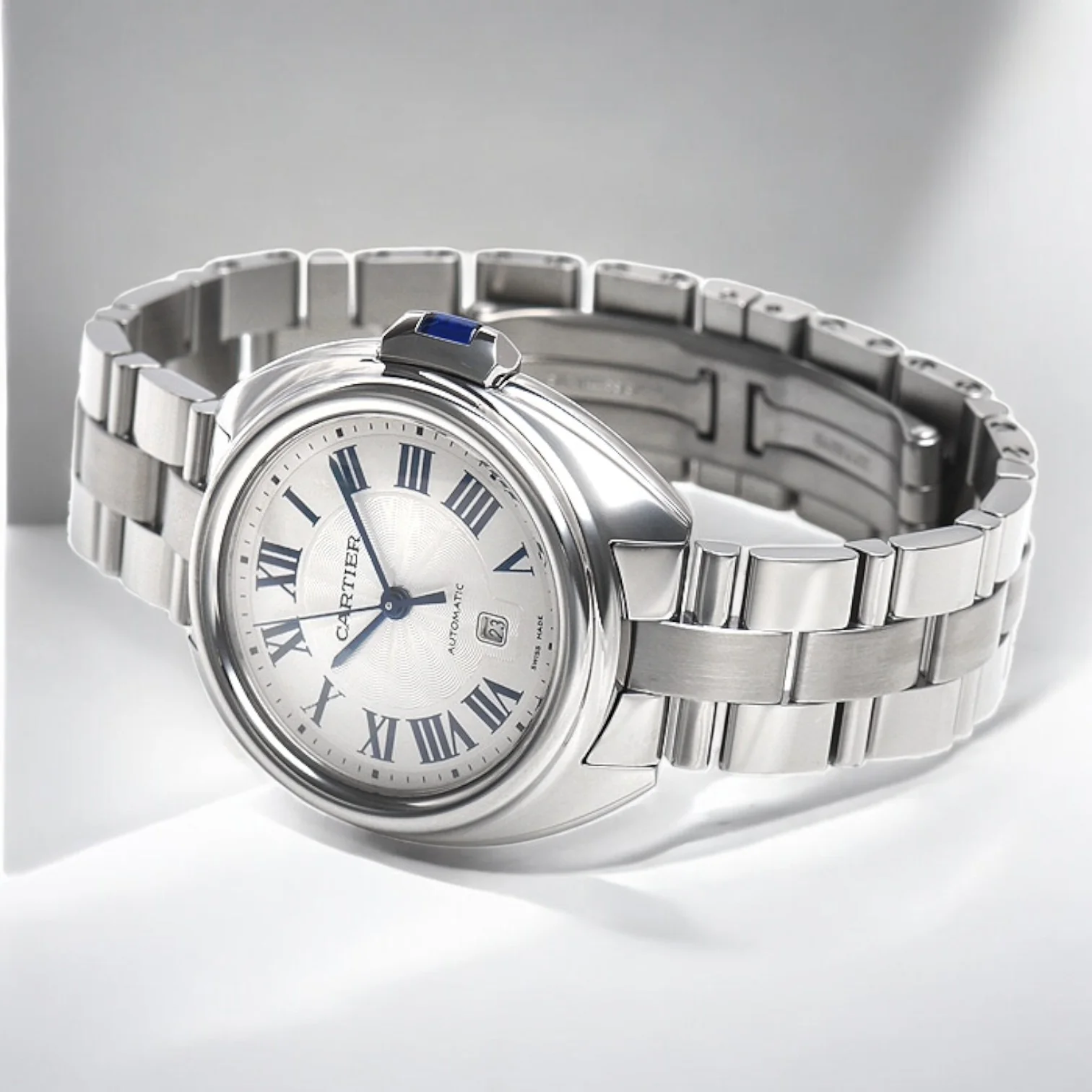 La Clé de Cartier ref. WSCL0005 is an elegant 31 mm watch in stainless steel. Its silvered flinqué sunray dial is adorned with blue Roman numerals and blued-steel sword-shaped hands. It is powered by the automatic caliber 1847 MC, offering a power reserve of approximately 42 hours. The crown, set with a blue synthetic spinel, adds a distinctive touch. Water-resistant to 30 meters, it is accompanied by a stainless steel bracelet.