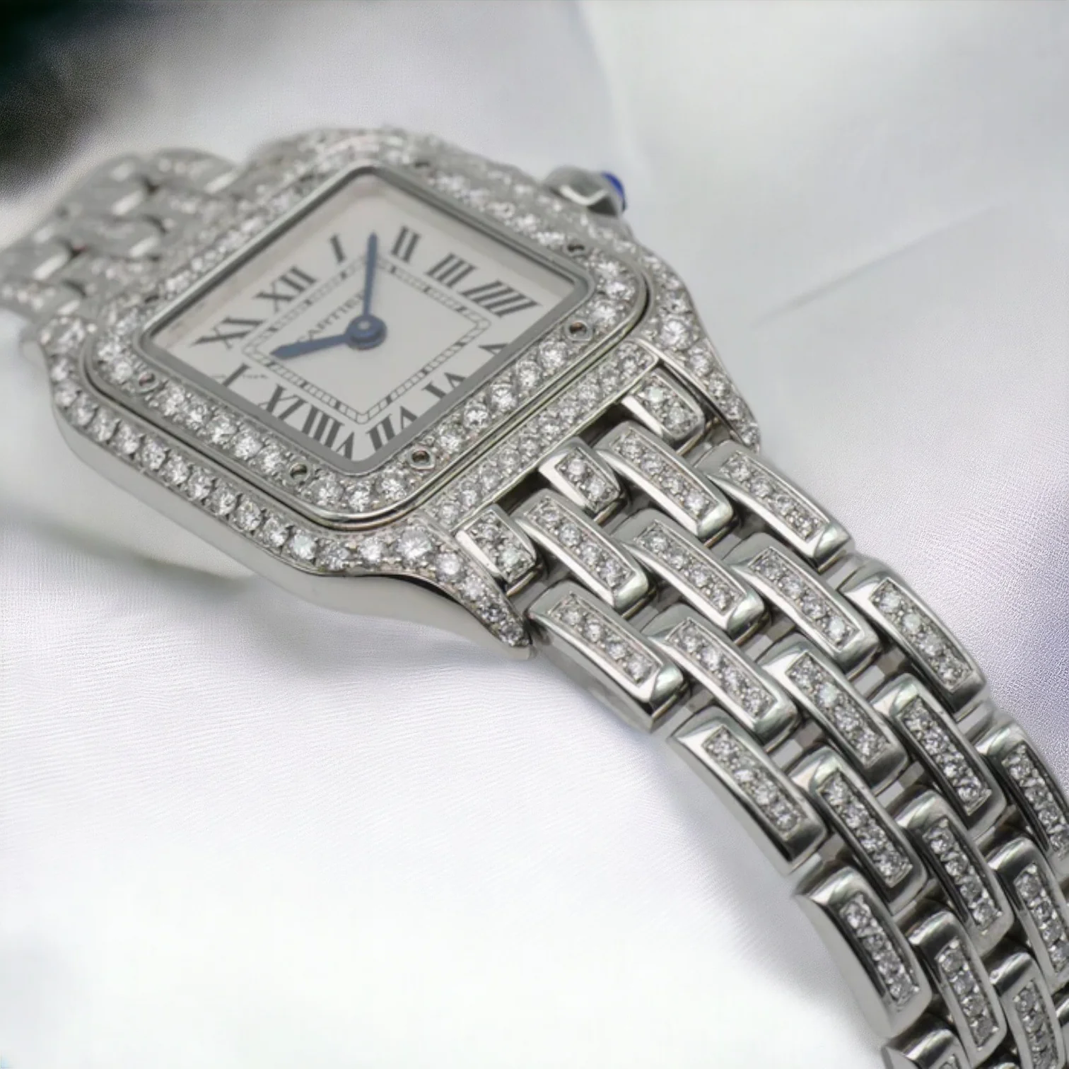This Cartier Panthère De Cartier watch ref.WSPN0006 has been custom-set with VS-SI round brilliant-cut diamonds in G/H color. On this piece, we have custom-set diamonds on the bracelet (top side), shoulders, case and bezel. This unworn watch comes with the original box and papers and a full 2-year GWC warranty.