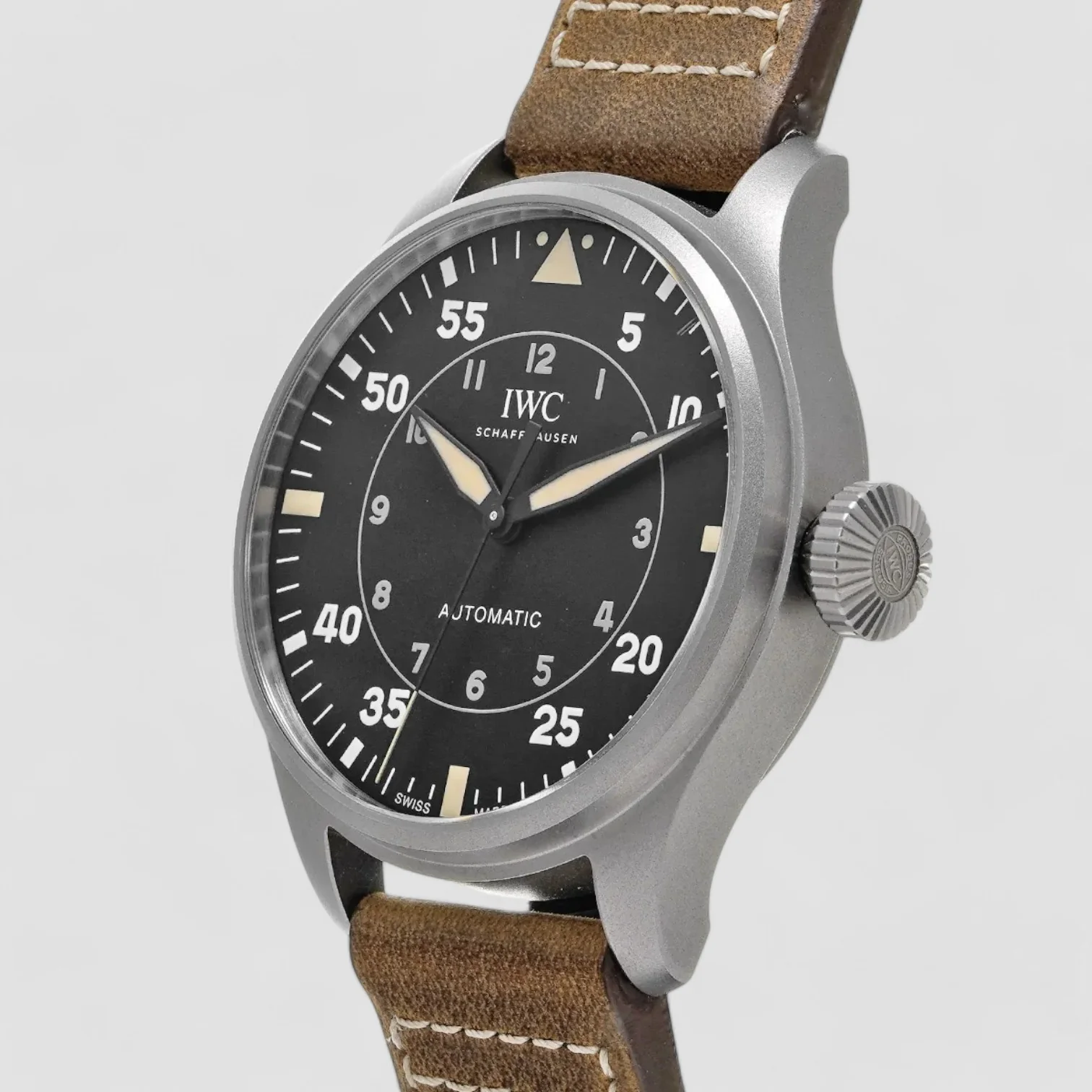 The IWC Big Pilot's Watch 43 Spitfire is an iconic aviator's watch, combining historic design with modern innovation. Featuring a 43 mm titanium case, it has a black dial with luminescent numerals and hands for optimal legibility. Its automatic movement ensures reliable performance and an extended power reserve. Water-resistant to 100 meters, it is distinguished by its brown leather strap equipped with the EasX-CHANGE system, making it easy to change. An elegant and functional timepiece for aviation enthusiasts.