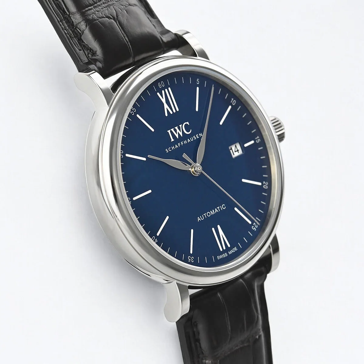 The Portofino Automatic Edition â150 Yearsâ (Ref. IW356518) is an elegant and timeless watch created to celebrate IWCâs 150th anniversary. Limited to 2,000 pieces, it features a 40 mm stainless steel case and a blue lacquered dial with rhodium-plated hands and refined indexes. Powered by the automatic calibre 35111, it offers a power reserve of 42 hours. Water-resistant to 30 metres, it is completed by a black alligator leather strap, perfectly embodying the sophisticated style of the Portofino collection.