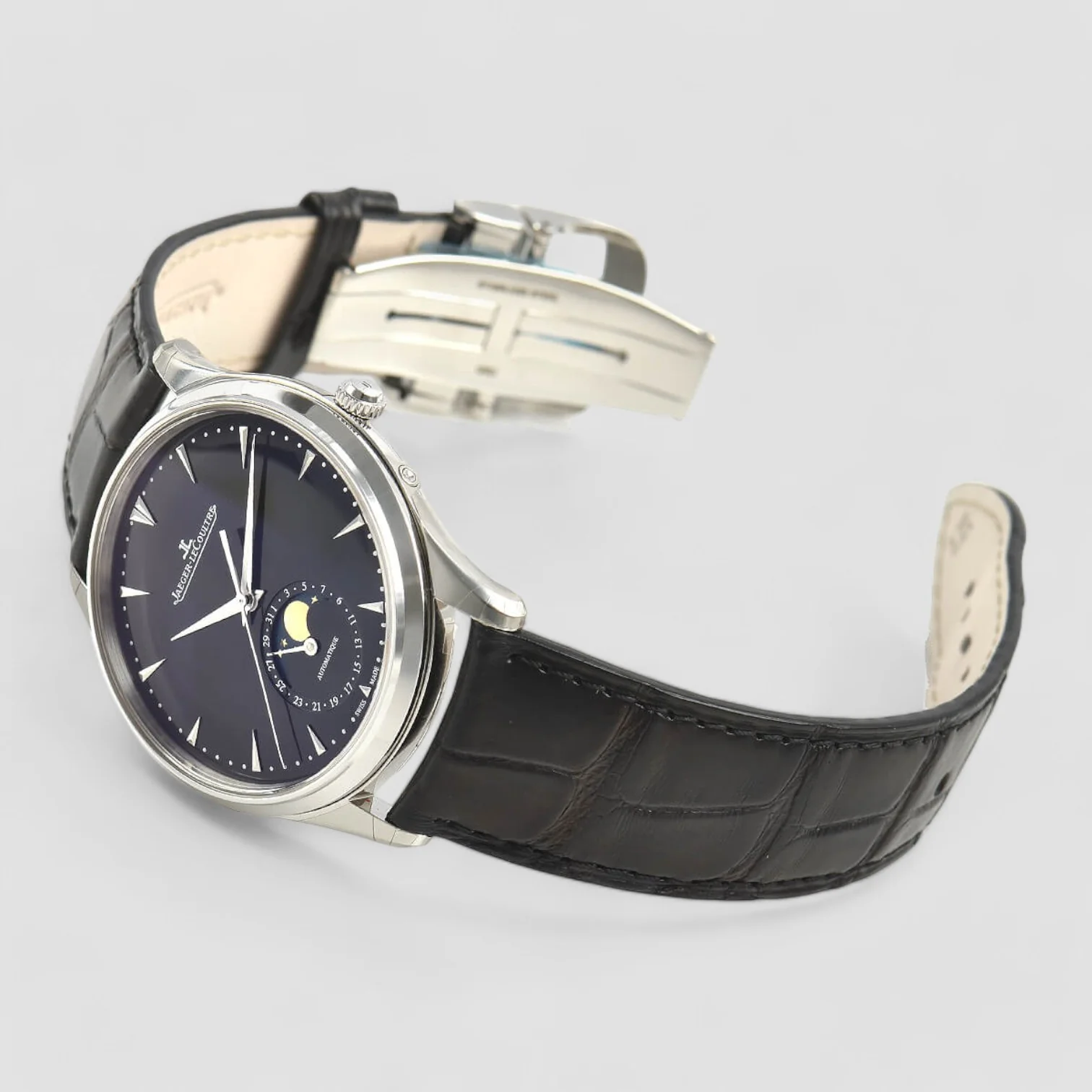 The Jaeger-LeCoultre Master Ultra Thin Moon, reference Q1368470, embodies the elegance and sophistication of watchmaking. Its stainless steel case, 39 mm in diameter and 9.9 mm thick, houses an automatic movement, the Jaeger-LeCoultre Calibre 925/1, offering a power reserve of around 43 hours. The black dial displays hours, minutes, seconds, date and moon phases with remarkable clarity. Water-resistant to 50 meters, this watch is fitted with a black leather strap with folding clasp, combining comfort and timeless style.