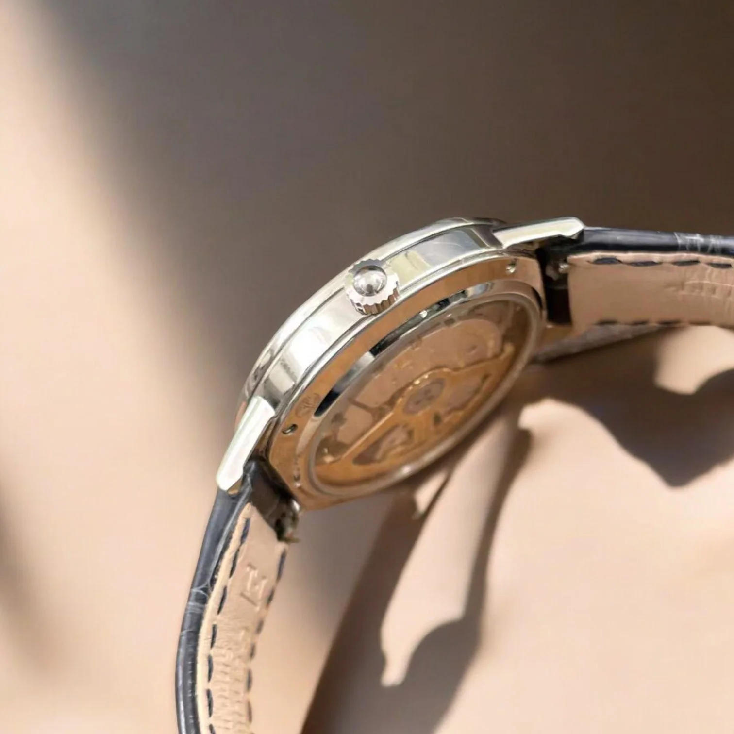 The Jaeger-LeCoultre Rendez-Vous Classic Night & Day Q3448480 is an elegant timepiece featuring a 34mm stainless steel case adorned with approximately 60 diamonds totaling around 0.63 carats. Its blue, sunray-brushed dial with frosted numerals and floral hands exudes sophistication. Powered by the automatic Calibre 898A/1 movement, it offers a 40-hour power reserve and includes a day/night indicator. The watch is water-resistant up to 30 meters and is complemented by a blue leather strap.