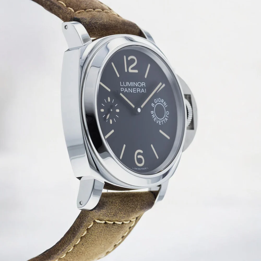 The Panerai Luminor 8 Days Acciaio (PAM00590) is a robust and iconic timepiece that exudes Panerai's signature style. Featuring a polished stainless steel case and a distinctive black dial with luminous Arabic numerals and hour markers, it ensures excellent readability. Powered by the hand-wound P.5000 movement, it boasts an impressive 8-day power reserve. With its characteristic crown-protecting bridge and classic design, this watch combines elegance, durability, and functionality, making it a perfect companion for everyday adventures.