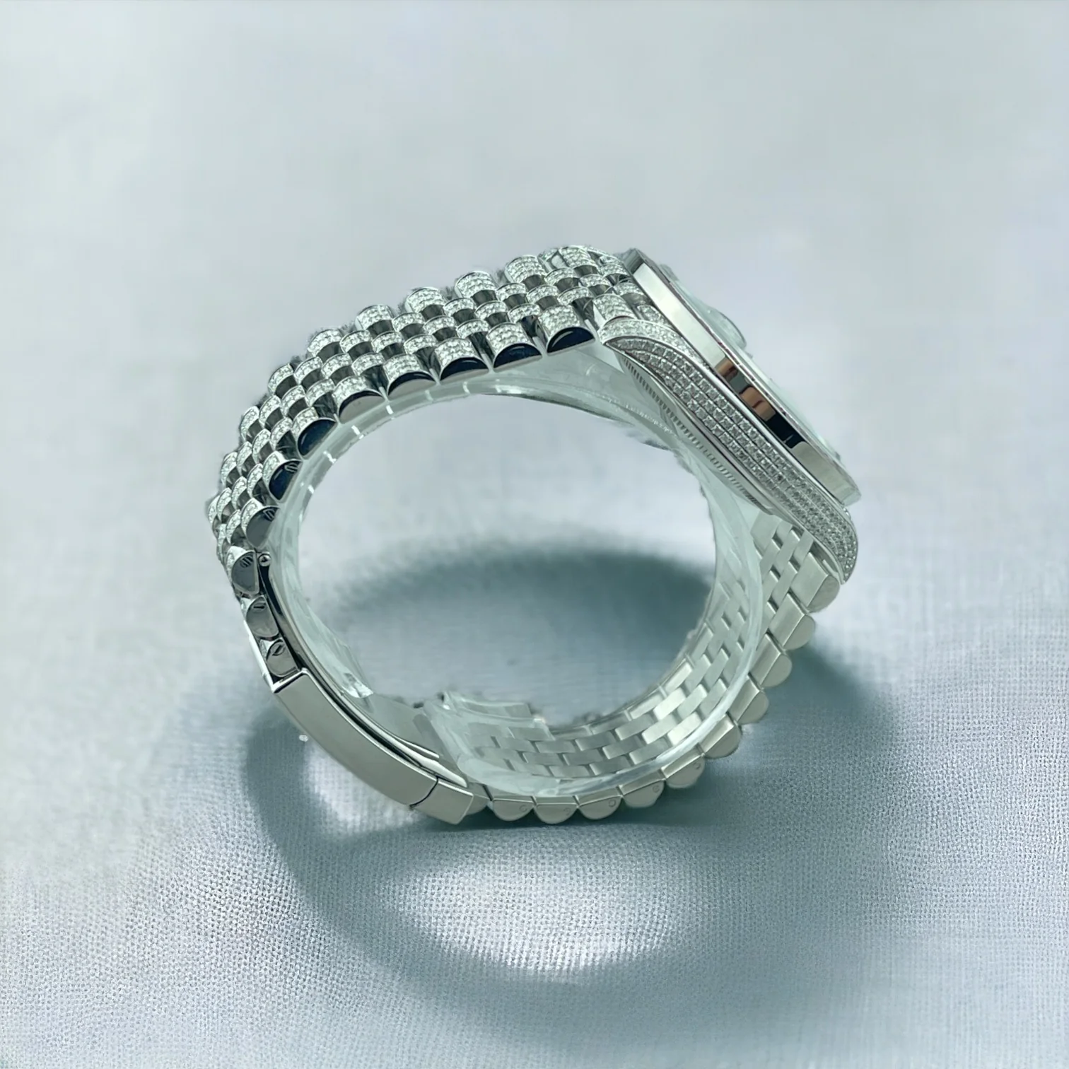 The Rolex Datejust 41 Full Iced out – Ruby bezel - Red roman dial is enhanced by a full diamond setting on stainless steel, with a matching diamond dial. This timeless watch combines the iconic elegance of Rolex with a sumptuous sparkle, ideal for lovers of luxury. Crafted with attention to detail and precision, it offers a unique aesthetic that does not go unnoticed. An exceptional piece for discerning collectors.