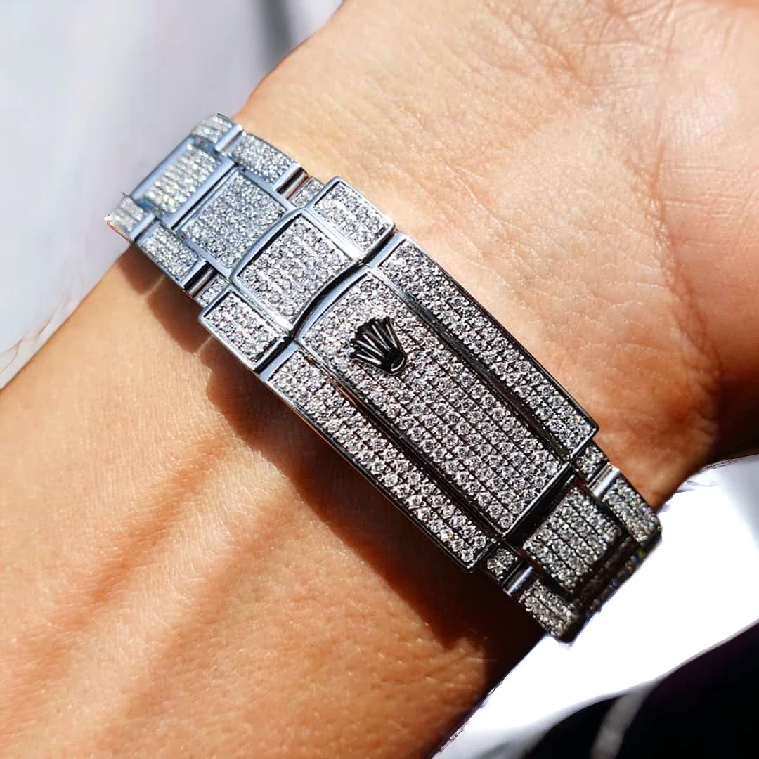 This Datejust ref.126300 watch has been custom set with round brilliant cut diamonds in G/H VS-SI color. On this watch, we have custom set the case, shoulders, clasp and bracelet. We have also custom set the original bezel, but for this part we have used a pavé diamond setting where the stones are positioned closer together in a honeycomb pattern (fewer spaces, more diamonds, minimal edges).