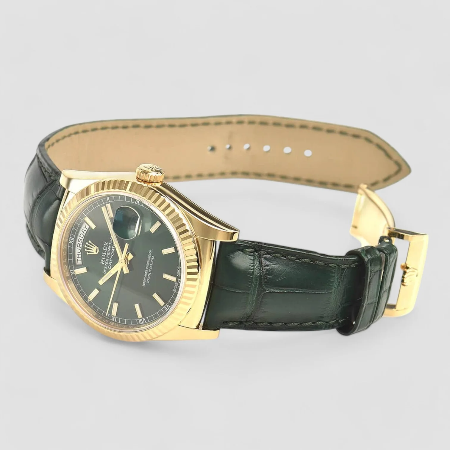 The Rolex Day-Date 118138 is a luxurious watch that embodies timeless elegance. Its 36 mm 18-carat yellow gold case is enhanced by a leather strap that gives it a refined style. Featuring a green dial with baton indexes and displaying the day at 12 o'clock and the date at 3 o'clock, it combines functionality and aesthetics. Powered by an automatic movement, it guarantees exceptional precision and is water-resistant to 100 meters.