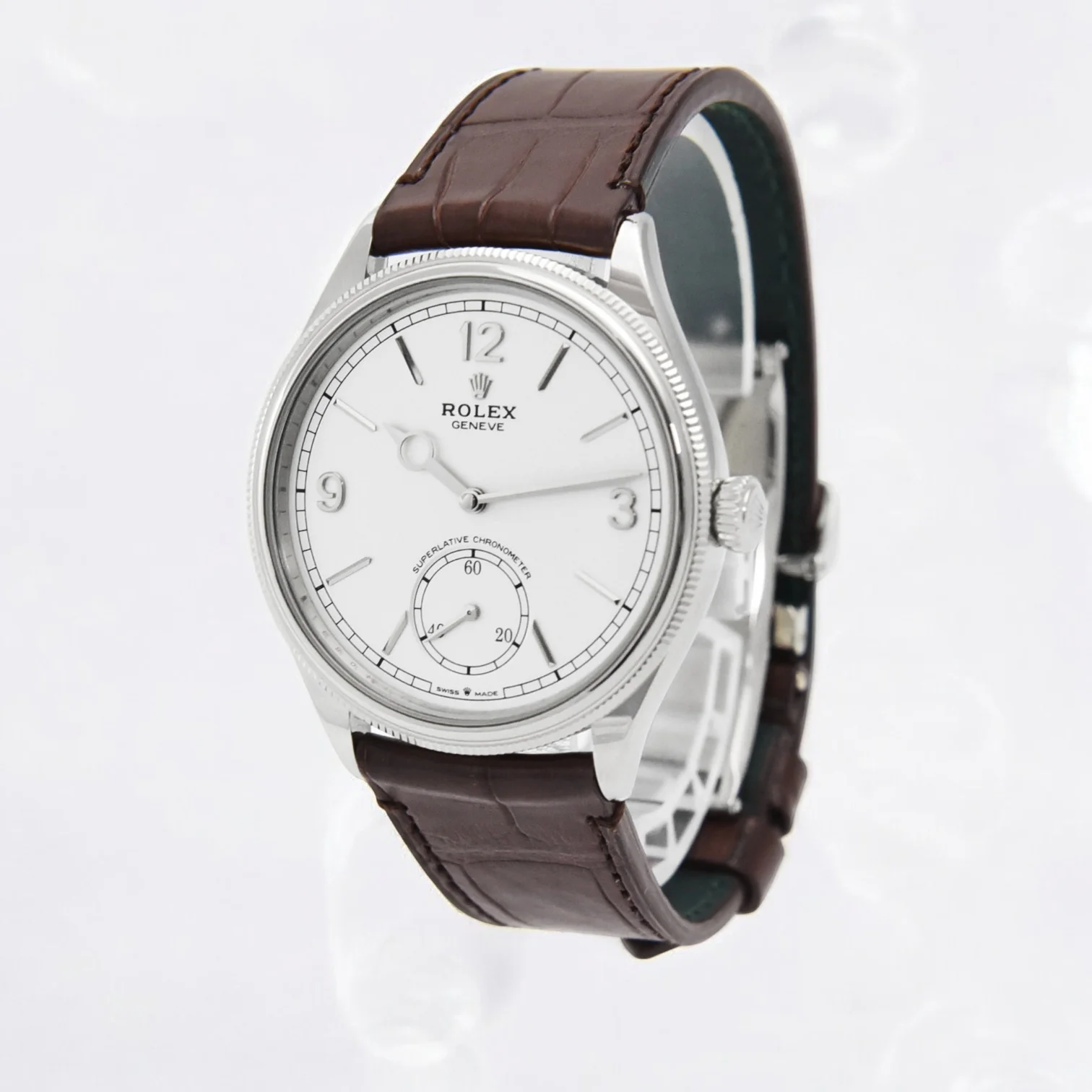 The Rolex Perpetual 1908 M52509-0002 is a sophisticated masterpiece, blending modern innovation with timeless elegance. Its 39mm 18k white gold case exudes understated luxury, while the white domed dial showcases a minimalist design with bold black hour markers, small seconds at 6 o’clock, and slender hands. Powered by the self-winding Caliber 7140, this watch offers exceptional precision and a 66-hour power reserve. Water-resistant up to 50 meters, it’s a refined choice for the discerning enthusiast.