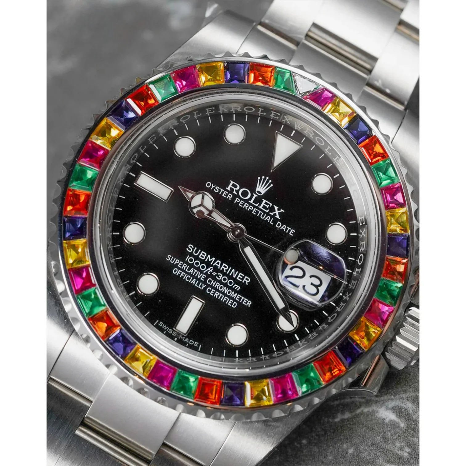The customized Rolex Submariner 116610 with a "Haribo" bezel set with diamonds and multi-colored stones is a unique luxury watch. This model combines the iconic design of the Submariner with vibrant and bold details, while maintaining its technical features, such as water resistance and automatic movement. This exclusive creation is perfect for lovers of customization and rare pieces.
