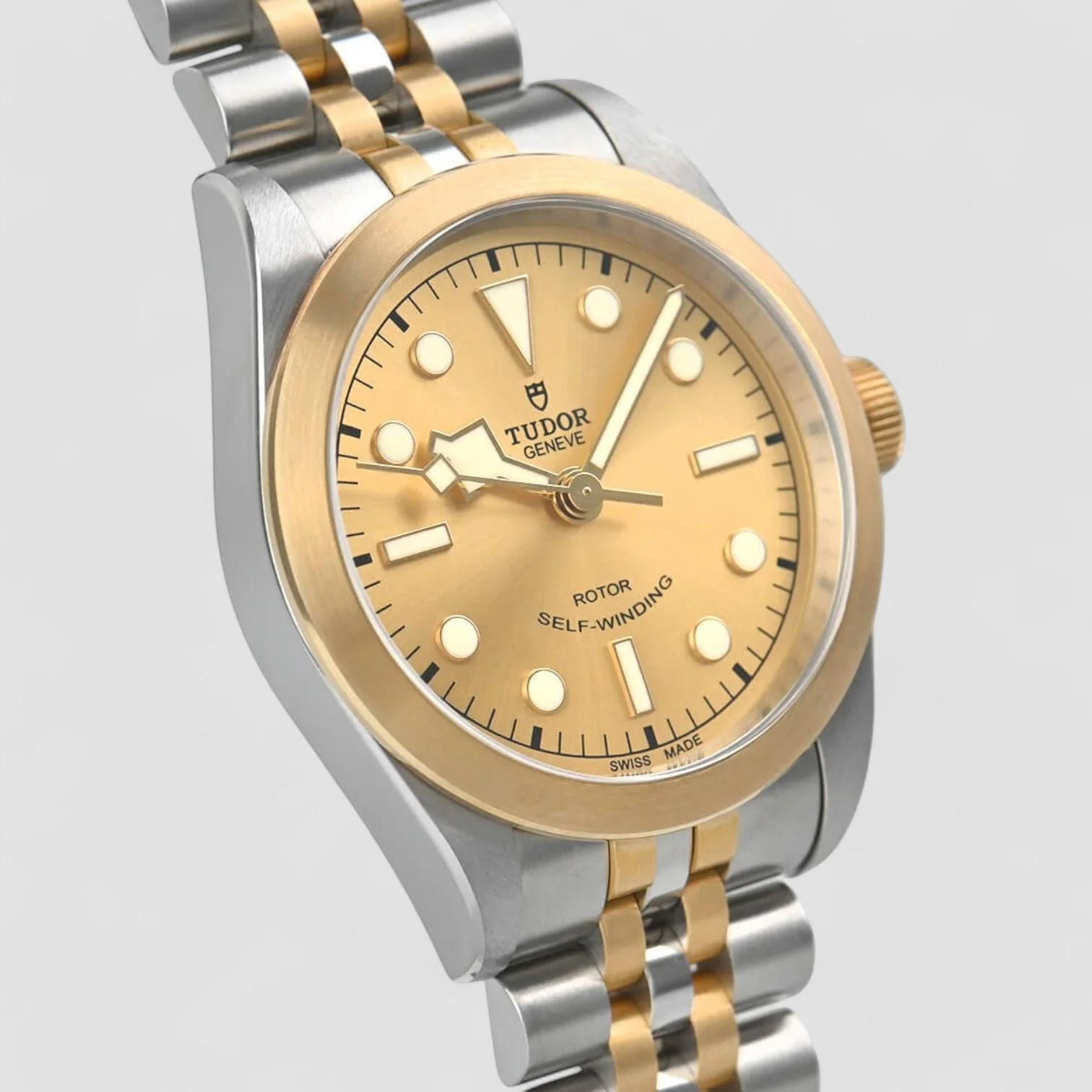 The Tudor Black Bay 36, reference M79503-0002, combines elegance and functionality. Its stainless steel case, 36 mm in diameter and 11.9 mm thick, houses a self-winding mechanical movement, caliber T601, offering a 38-hour power reserve. The champagne-colored dial is adorned with yellow gold hour-markers and hands, with snowflake-shaped hands characteristic of the Black Bay collection. The yellow gold screw-down crown is engraved with the Tudor rose. Water-resistant to 150 meters, this watch is fitted with a five-link stainless steel and yellow gold bracelet with safety folding clasp, combining comfort and durability.