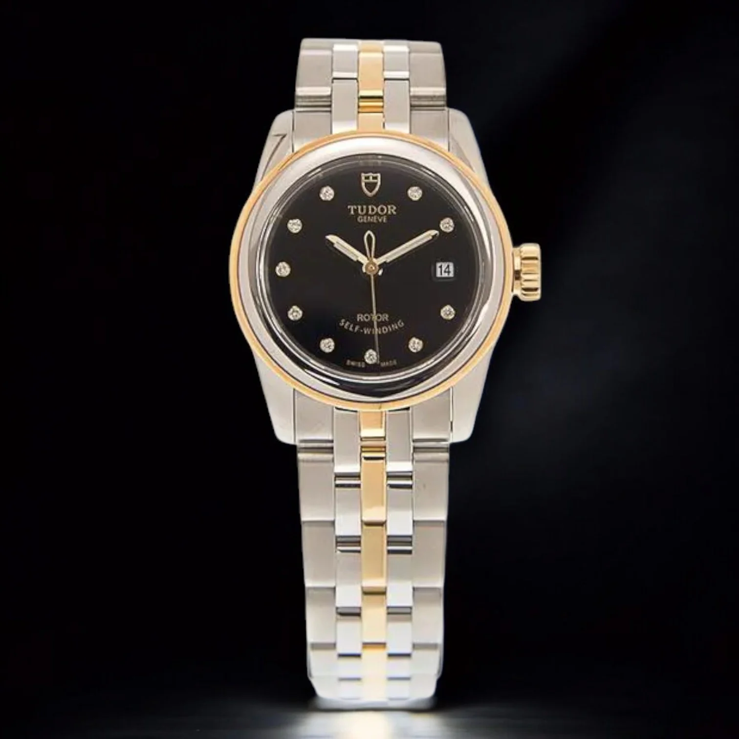 The Tudor Glamour Date reference M51003-0007 is a 26 mm unisex watch in stainless steel and 18 carat yellow gold. Its black dial is decorated with diamond indexes, offering a touch of elegance. Equipped with the automatic Tudor calibre 2671, it has a power reserve of approximately 38 hours. The two-tone steel and yellow gold bracelet completes its sophisticated look. Water-resistant to 100 metres, this watch embodies Tudor's watchmaking expertise.