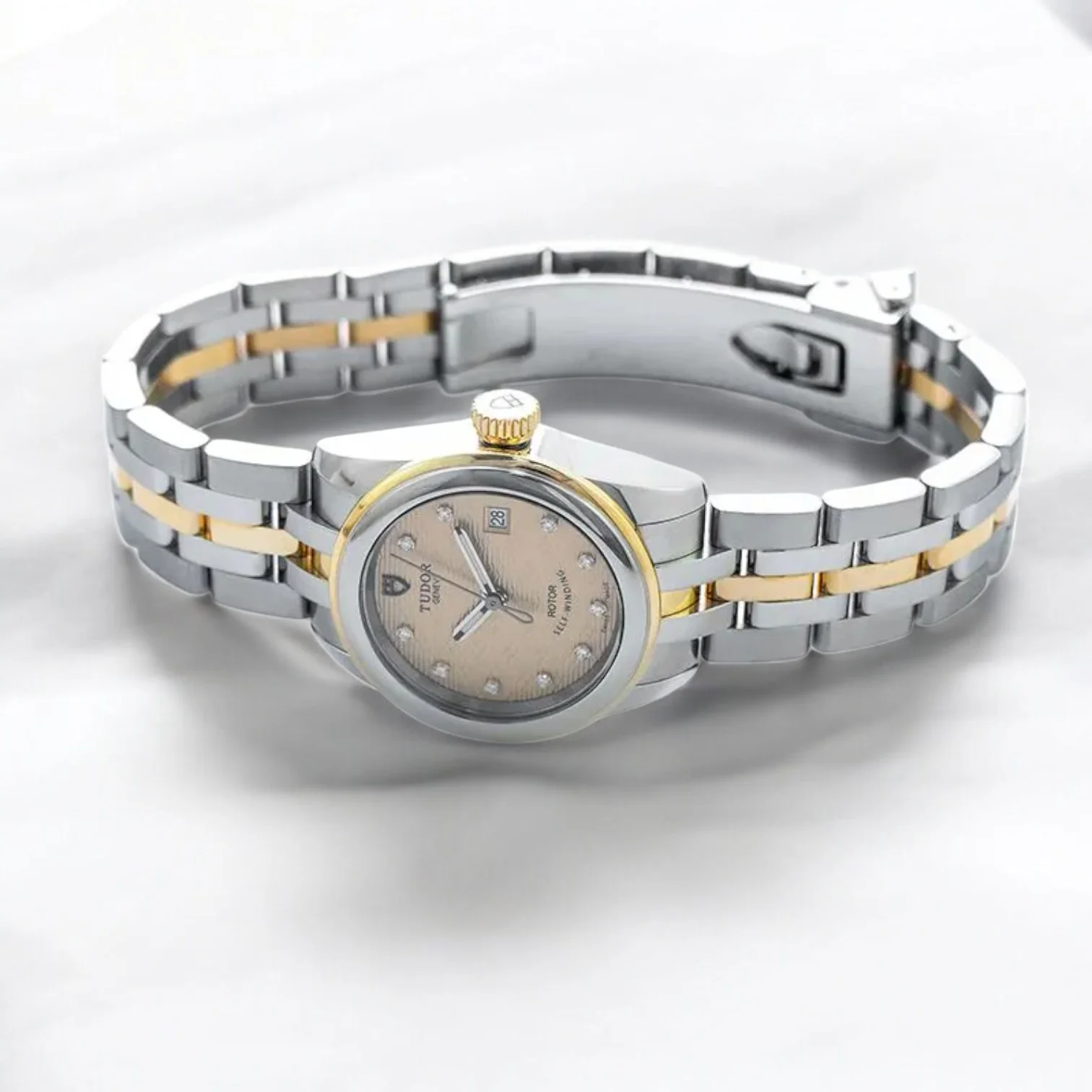 The Tudor Glamour Date reference M51003-0005 is a 26 mm ladies' watch in stainless steel and 18K yellow gold. Its champagne dial with jacquard pattern is adorned with diamond-set indexes, offering refined elegance. Equipped with the automatic T201 caliber, it has a power reserve of 38 hours. Water-resistant to 100 meters, it is fitted with a two-tone steel and yellow gold bracelet with a folding clasp.